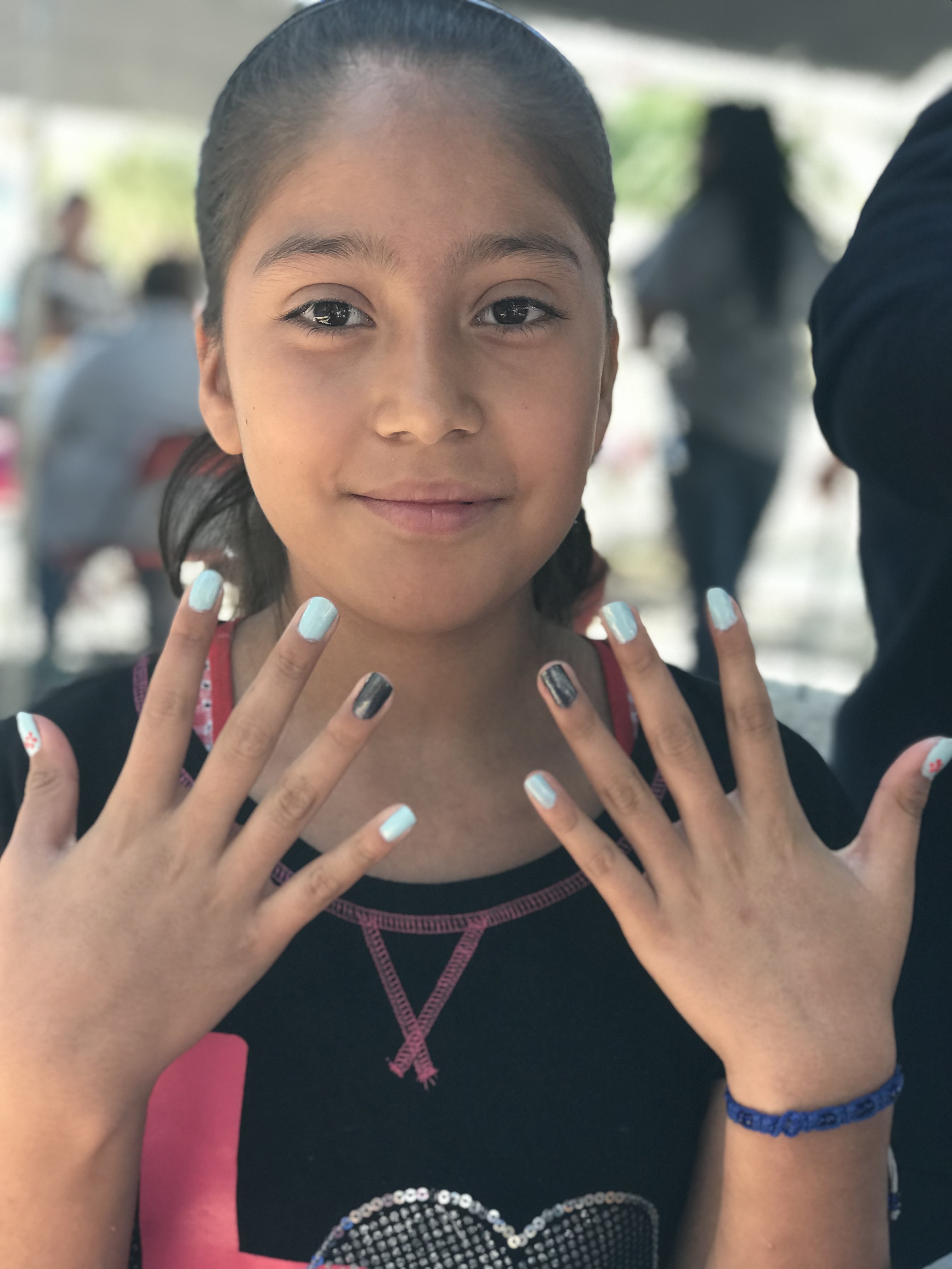 Jimena (I-mee-na) is a born leader (literally). The oldest of two brothers -a toddler and an infant- she steps up to help raise her siblings. As I painted her nails, we realized that she had an uncle that lived in California. She immediately assumed that since I was from the States, I MUST know him. It was a little harder to understand her because she was wearing a retainer that caused her to form a slight lisp. Once I realized we could use Google Translate to communicate, I could barely keep up with the conversation – she was so excited! We talked about her neighborhood, mother, and brothers. While her nails dried, I directed her over to one of the gals from my church so she could get her hair braided. Strangers didn’t scare her. As soon as she sat down, her mouth never stopped moving. I overheard her tell the stylist, “…she’s my friend.” I looked up to see Jimena staring and pointing at me, smiling. At that moment I was thankful for the sunglasses I was wearing so no one could see the tears that started to form in my eyes. I coughed and choked back an overdue cry session.